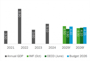 • The GDP growth forecast for 2025 has been revised in Budget 2026 to a more cautious range of 4.0% to 4.8% (Budget 2025: 4.5-5.5%), reflecting adjustments due to evolving global and domestic economic conditions. Meanwhile, real GDP growth estimated at 4.0- 4.5% for the full year 2026, aligning with the 13th Malaysia Plan’s medium-term target of 4.5% to 5.5% annually through 2030.