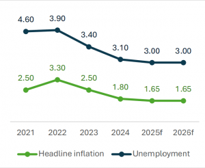 • Headline inflation is forecasted to remain benign at 1.3% to 2.0%, aided by subsidy targeting and stable global commodity prices, while gross exports are expected to grow at 2.8% amid moderating trade tensions. unemployment is projected to hold at 3.0%.