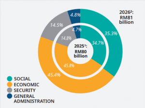 • Total expenditure for 2025 is estimated at RM412.1 billion, 2% lower than the previously budgeted RM421 billion. For 2026, the core federal expenditure is projected at RM419.2 billion (2% higher than the 2025 estimation; 0.4% lower than the 2025 initial budget). When off-budget contributions are included, the total public spending envelope rises to RM470 billion which comprises of: –