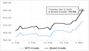 • Oil prices surged toward US$80/bbl as the Middle East conflict spreads and disrupted the flow of cargo and energy. Brent Crude Oil prices surged towards US$80/bbl as the Middle East conflict spreads and disrupted the flow of cargo and energy. The combination of halted or delayed Hormuz transits, temporary closures at Gulf financial markets, and interruptions at major Saudi energy assets tightened near-term supply and pushed a “war premium” into crude.