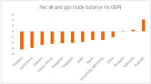 Figure 3: Major regional economies are net oil importers, exposing them to worsening trade balances when oil prices rise (Source: ING)
