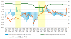 - Historically, monetary policy has tended to tighten in periods in which inflation exceeded the policy rate for a sustained duration of around 12 months. This is consistent with empirical evidence that second-round inflationary effects typically materialize with a 6 – 12 month lag in Malaysia