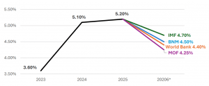 - In its latest published Economic and Monetary Review, BNM (BNM) projects Malaysia’s economy to expand by 4% to 5% in 2026 surpassing earlier projection of 4% to 4.5%. This growth is expected to be firmly anchored by resilient private sector consumption, low unemployment rate of 2.9% and steady wage growth. Headline inflation is projected to average 1.5% to 2.6% (previously: 1.5% – 2.3%), reflecting heightened external cost pressures, particularly from energy‑related inputs